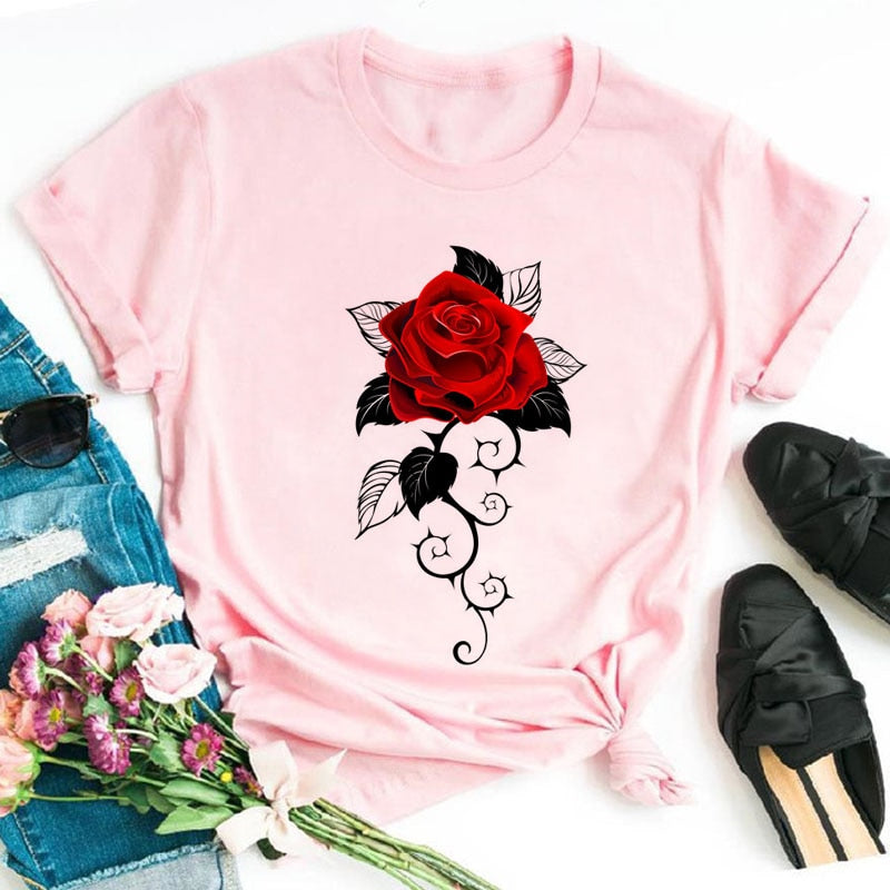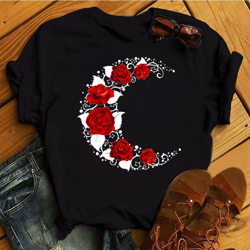 New Fashion Women Black T Shirt Red Rose Musical Note Printed T Shirt Harajuku Cute Graphic Tee Shirt Female Ladies Casual Tops