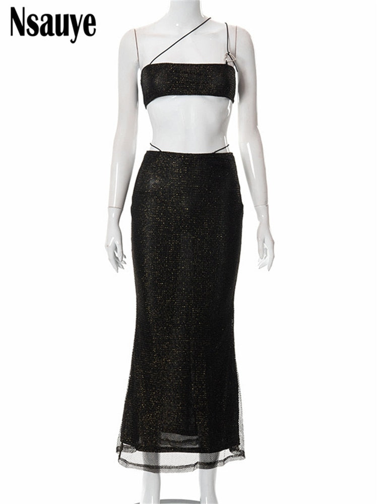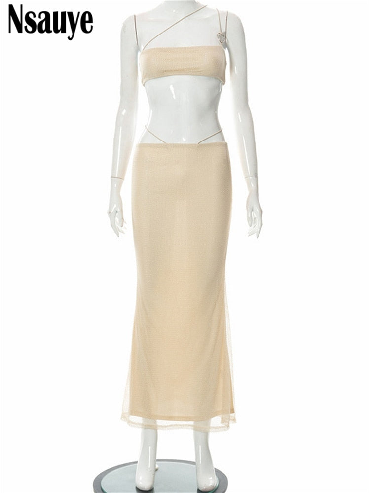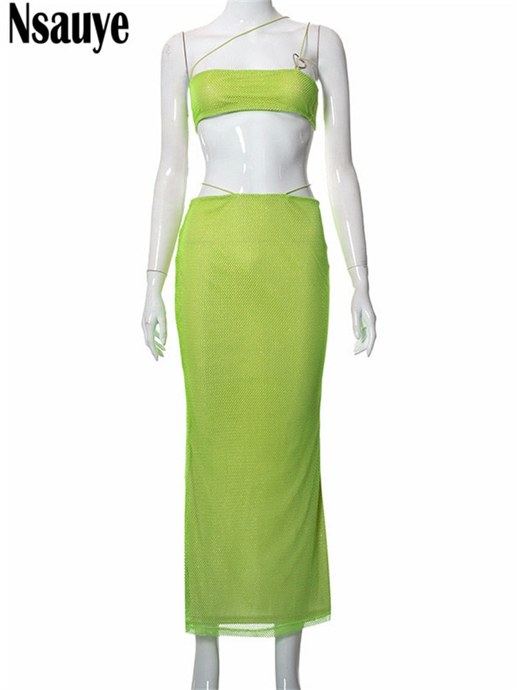 Nsauye 2022 Summer Y2K Women Clothing Mesh Dress Set Sexy Party Crop Tops And High Waist Long Skirt Two Piece Set Beach Outfits