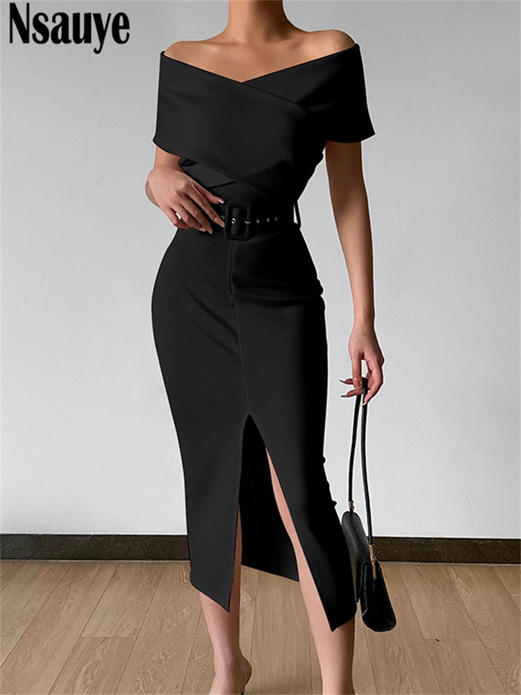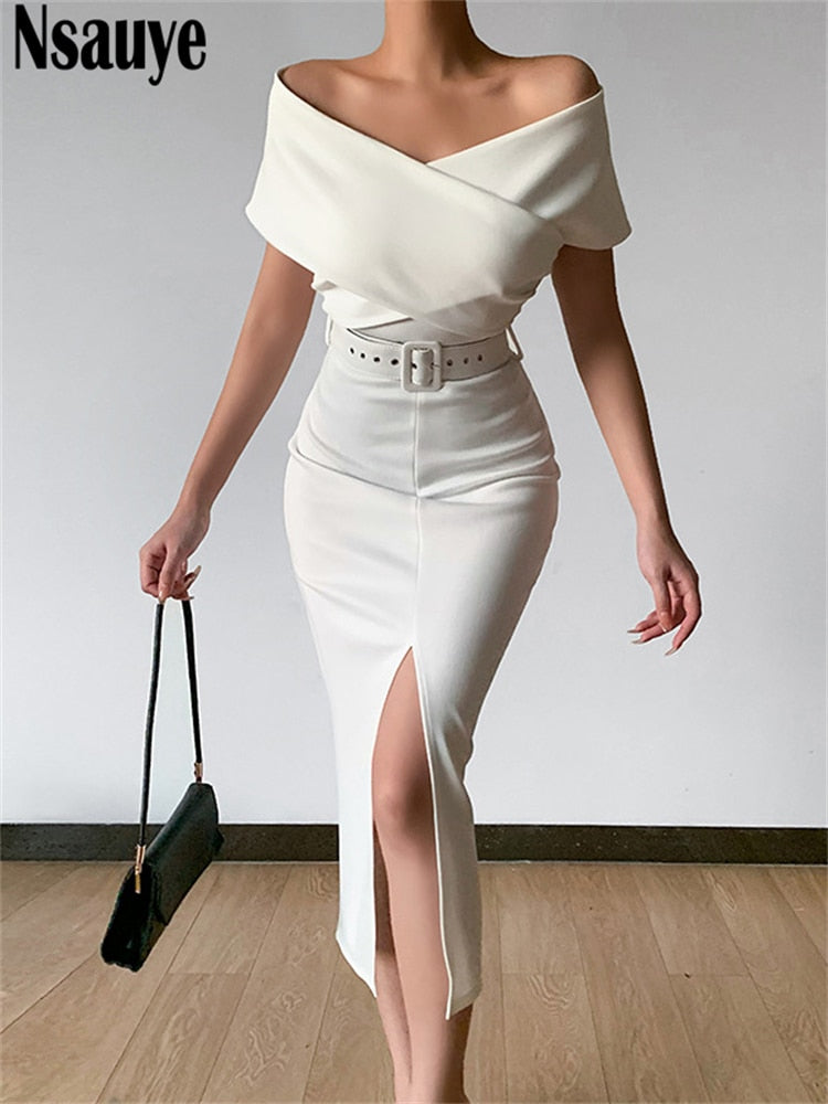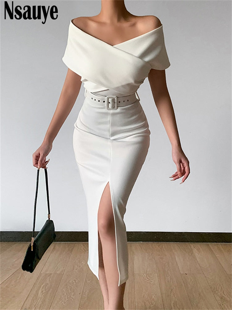 Nsauye Elegant Office Women Off Shoulder Split Sexy Black Bodycon Party Midi Dress 2022 Summer Evening White Dresses With Belt