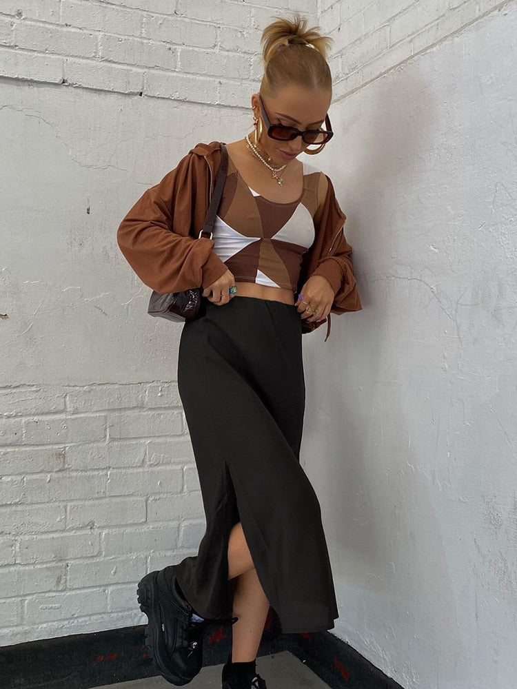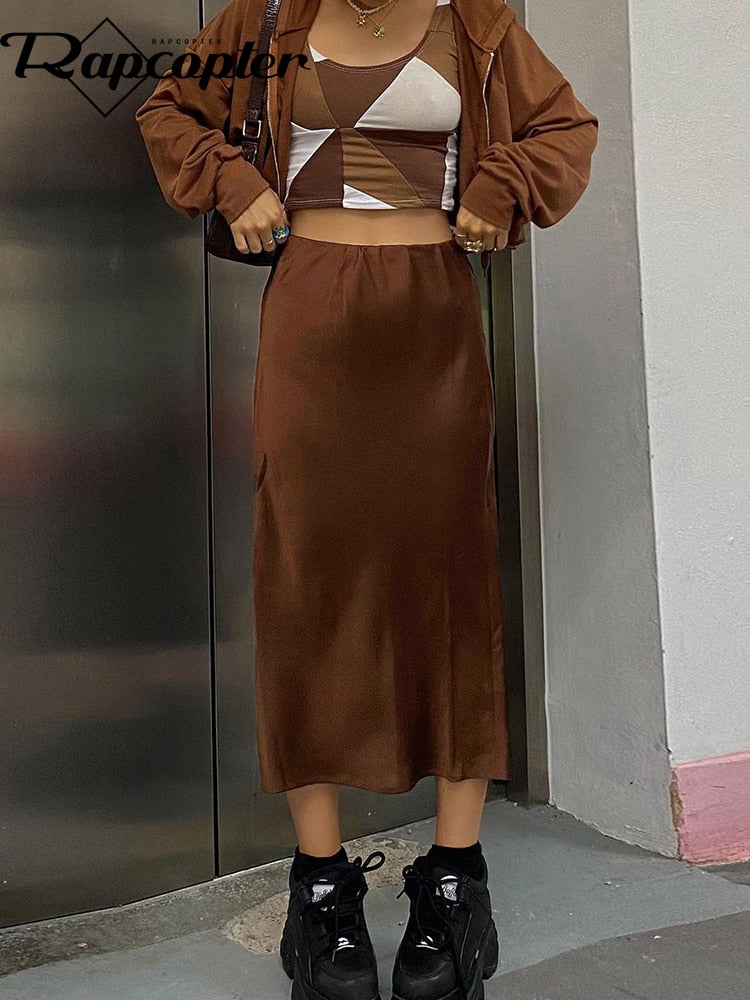 Rapcopter Satin Split Skirts y2k Vintage Long Skirts Women High Waisted Summer Skirts Women Harajuku Skirts 2021 90S New Buttom