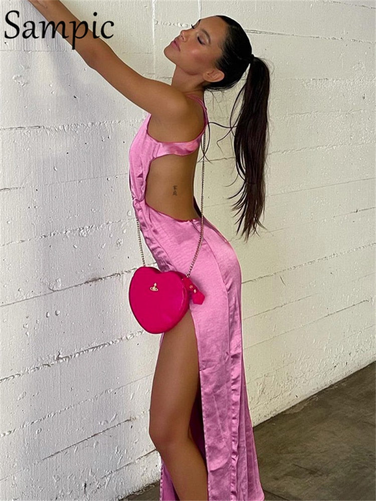 Sampic O Neck Sexy Women Satin Elegant 2022 Party New Year Club Bodycon Hollow Out Dress Long High Split Wrap Casual Dress