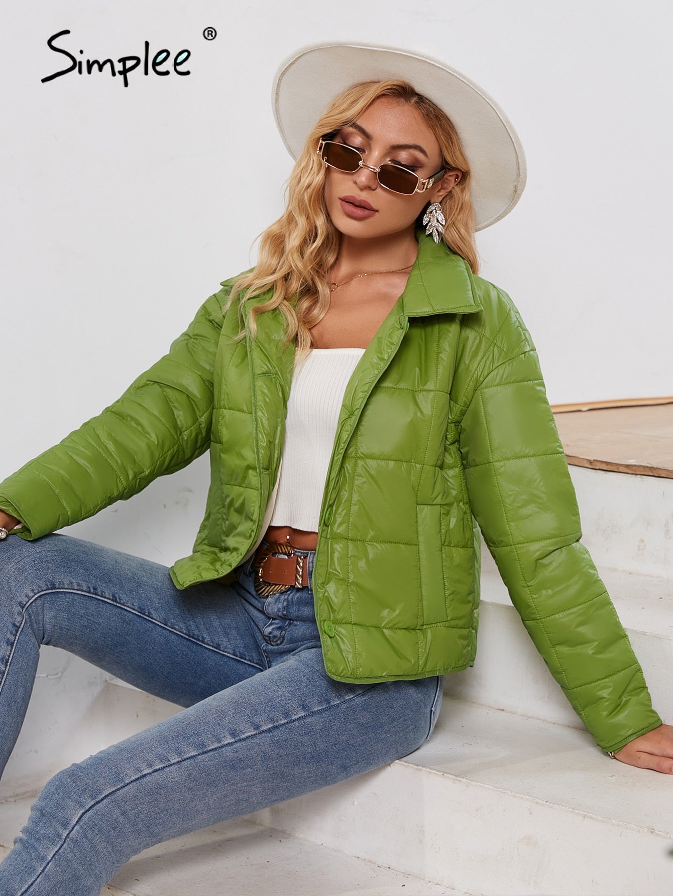 Simplee Green pocket lapel women short winter parkas Casual idyllic style warm quilted coat 2021 Office fashion puffer jackets