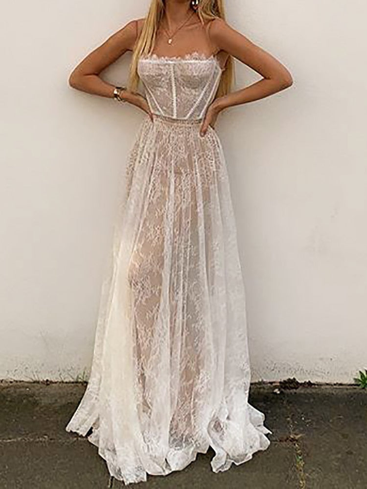 Simplee Sexy white lace summer women maxi dresses Elegant spaghetti strap backless dress Mesh female long dress vestidos 2021