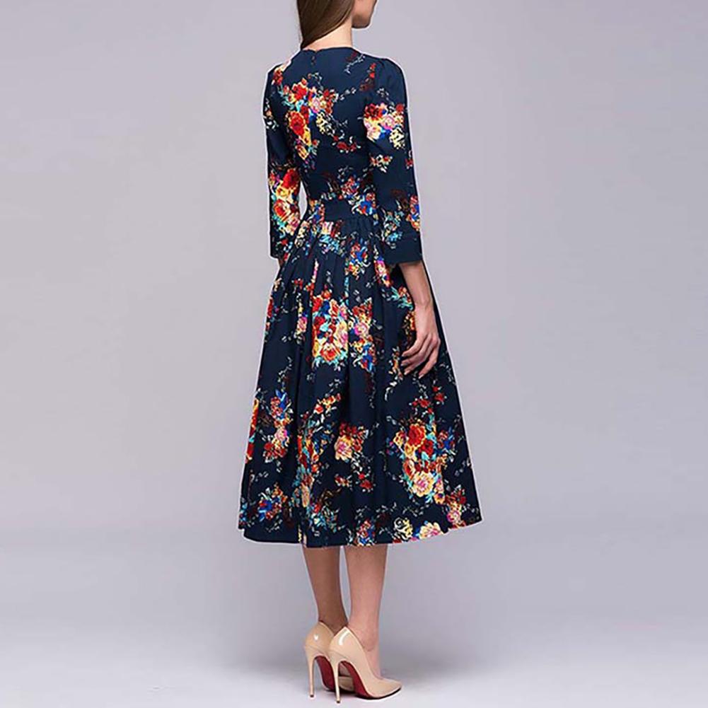 Women Dress Elegant Vintage Floral Print O Neck Long Sleeve Lace-up Waist Flared Loose A Line Midi Dresses Party