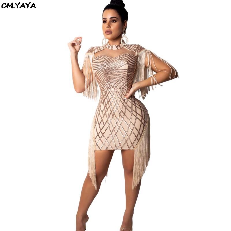 Women New Sequins Tassel Sleeve Side Cutout Stand Neck Sexy Midi Mini Dress Bodycon Bandage Club Party Dresses Vestidos CY8033