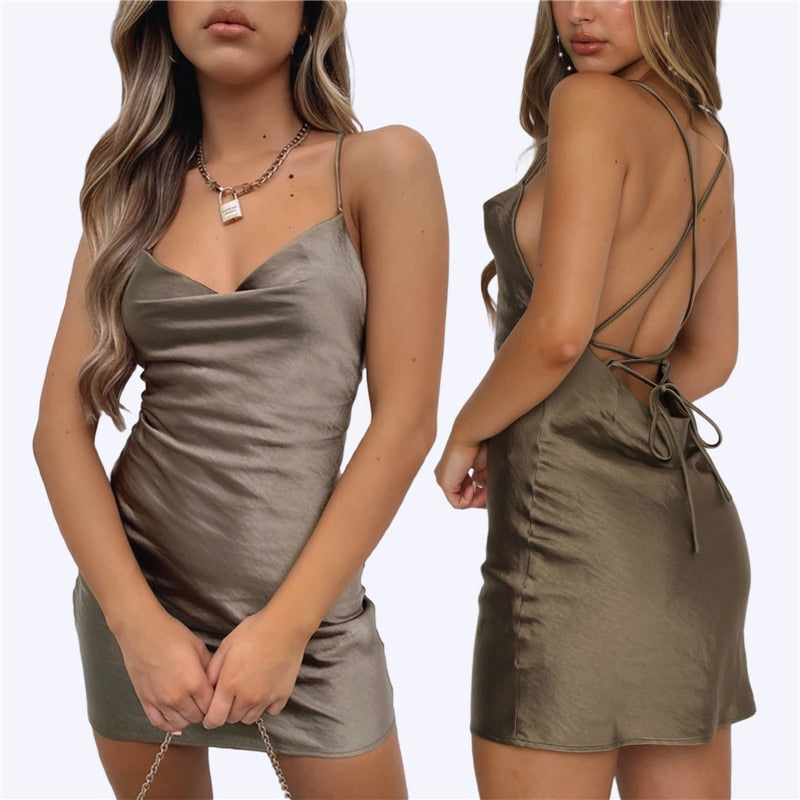 Women’s Back Cross Satin Dress Fashion Solid Color V-neck Lace-up Backless Slim Short Dress Party Clubwear Sexy Lady Sundress