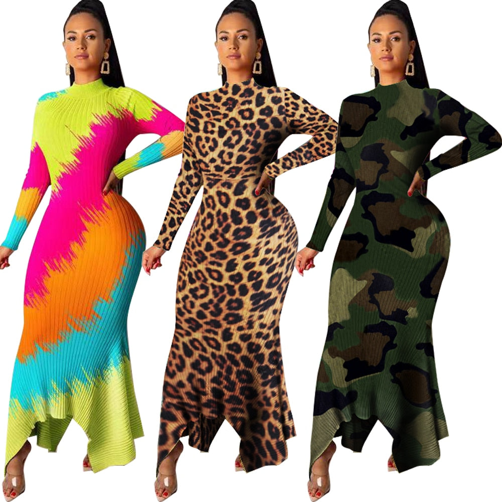 Women Winter Bodycon Long Maxi Dress Striped Leopard camouflage Print Knitted Sexy Club Night Party Full Sleeve Dresses K8862