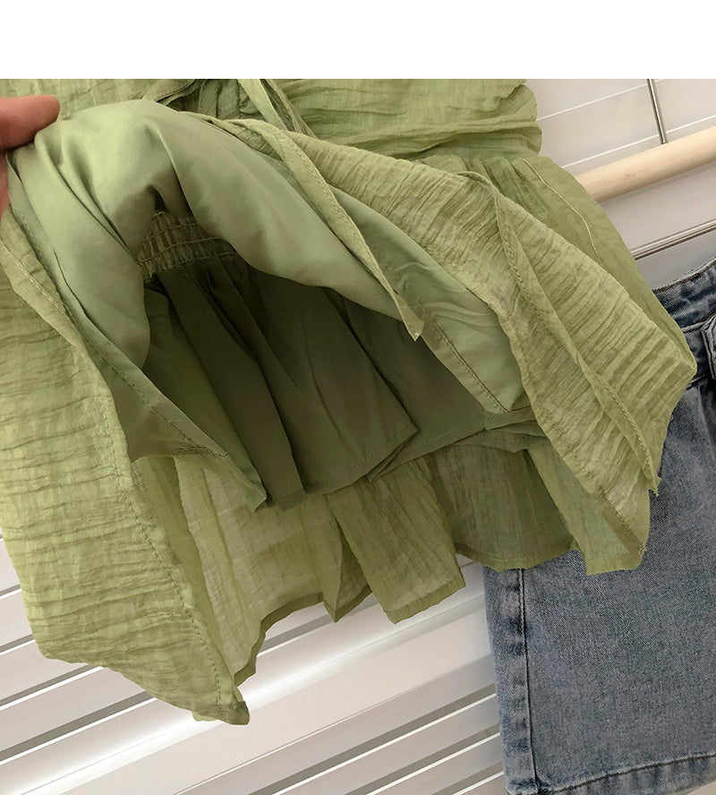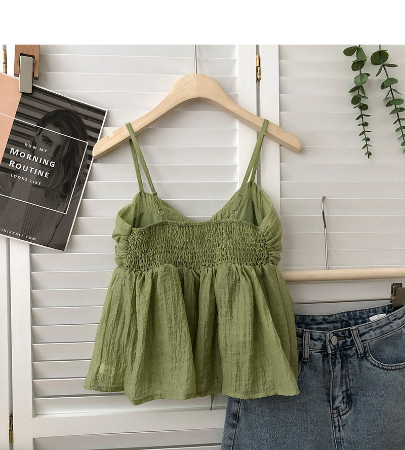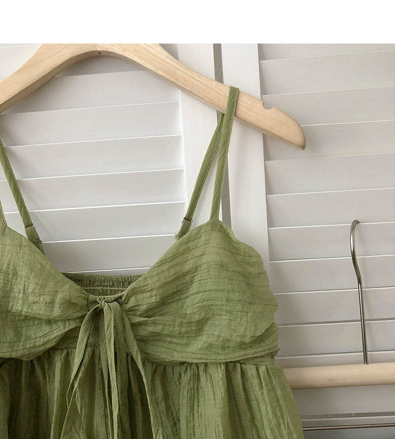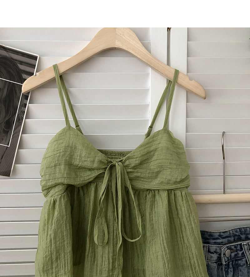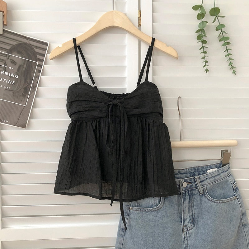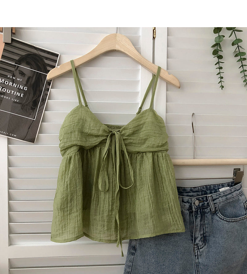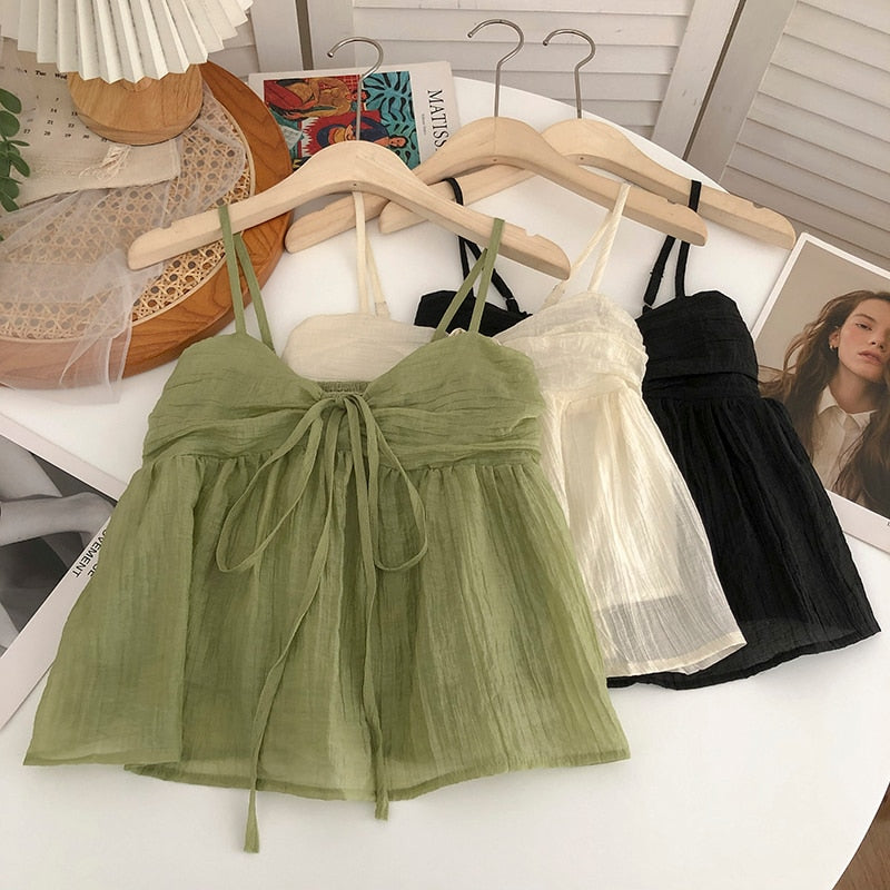 Wongn Summer New Korean Style Sweet Crop Tops All-Match Bow Tie Sleeveless Short Mesh Outer Wear Spaghetti-Strap Camisole Top 703-1