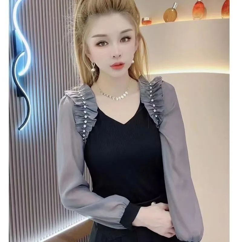 Wongn V-Neck Spliced Diamonds Folds Gauze Blouses Women's Clothing 2023 Autumn Winter New Elegant Tops Office Lady Shirts