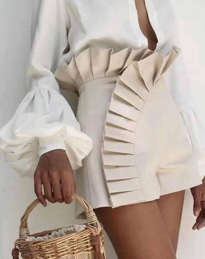 Wongn Wongn 2023 Fashion Women's Solid Color Pleated Lace Design High-Waisted Zip Shorts
