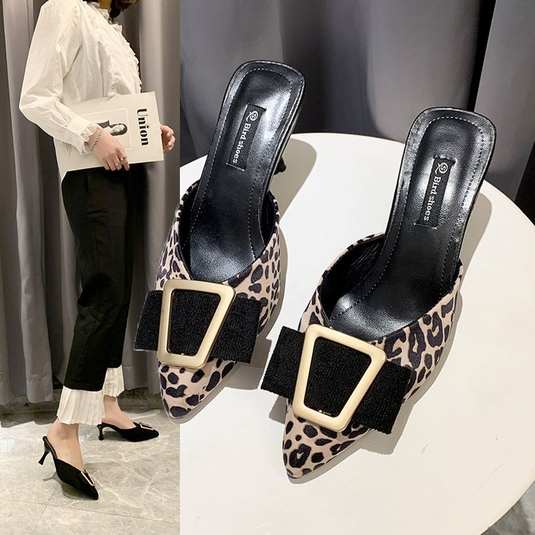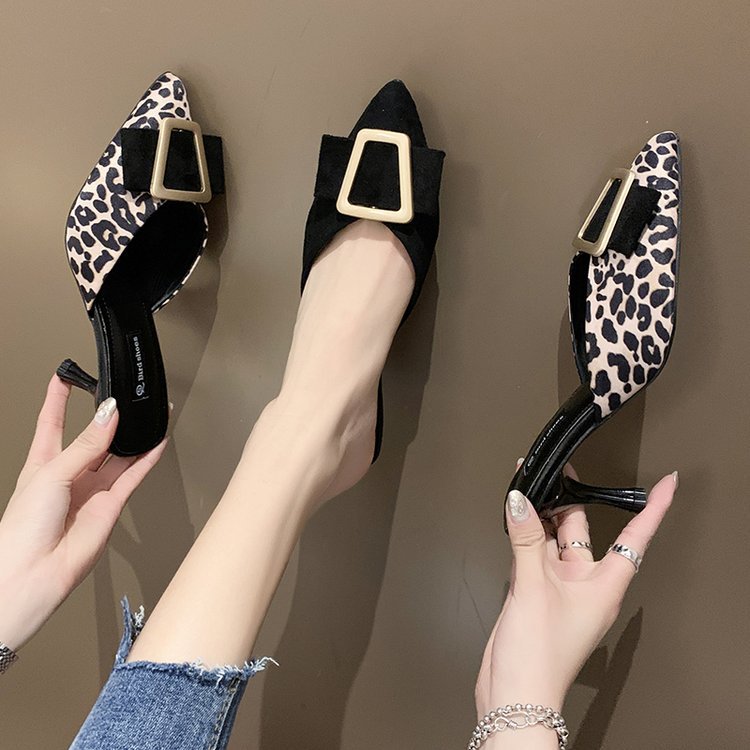 Wongn Wongn 2023 New Korean Version Of Leopard Print Metal Buckle Baotou Half-Length Sandals High Heels Women's Shoes