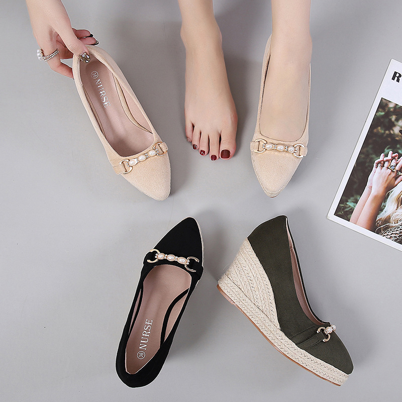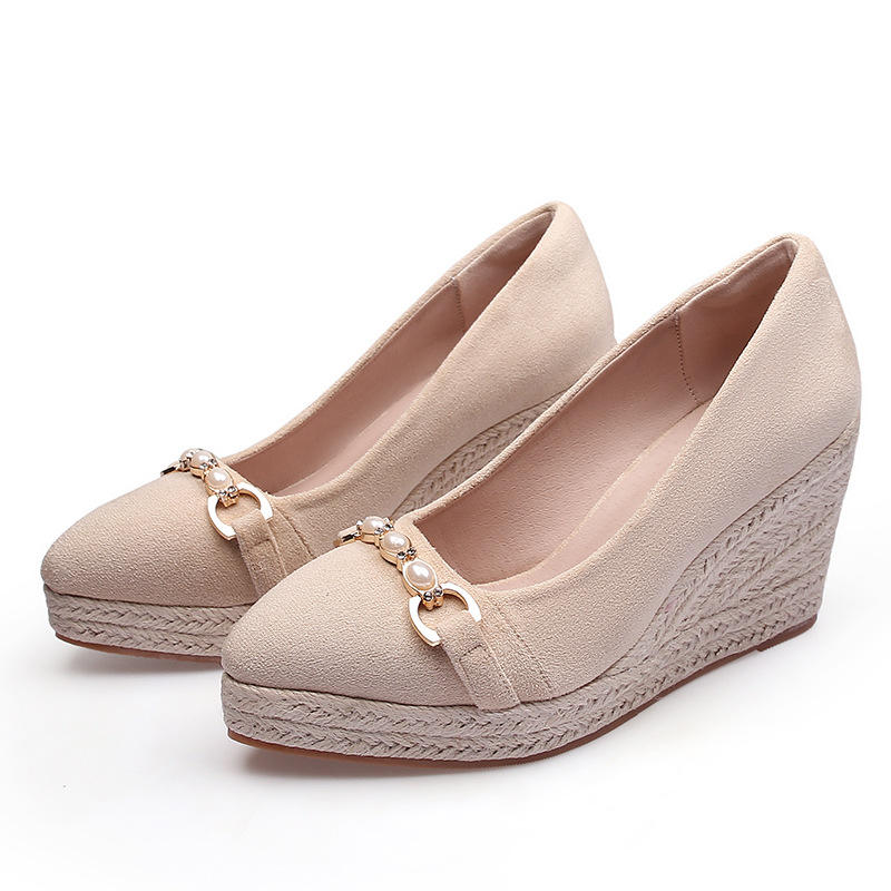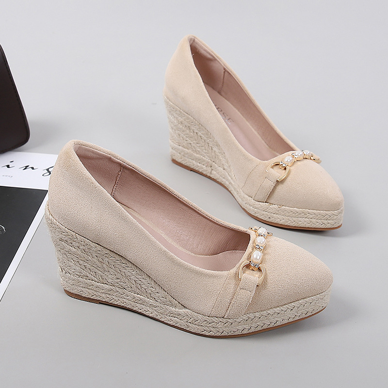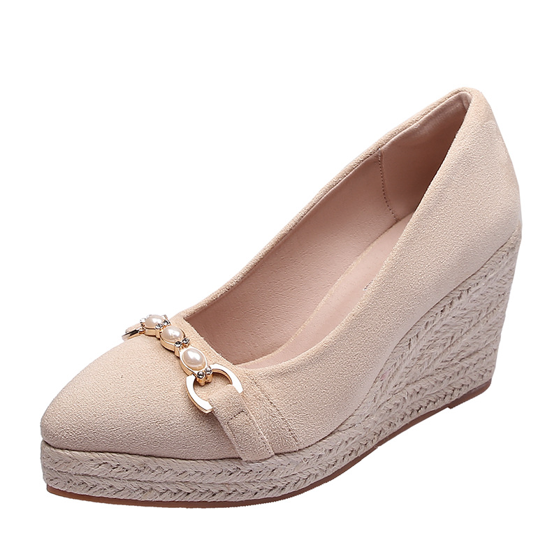 Wongn Wongn And Autumn New Slope Heel Pointed Mouth Thick Bottom Suede Pearl Decoration Grass Hemp Rope High Heel Single Shoes Women