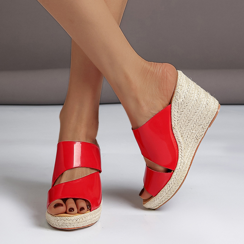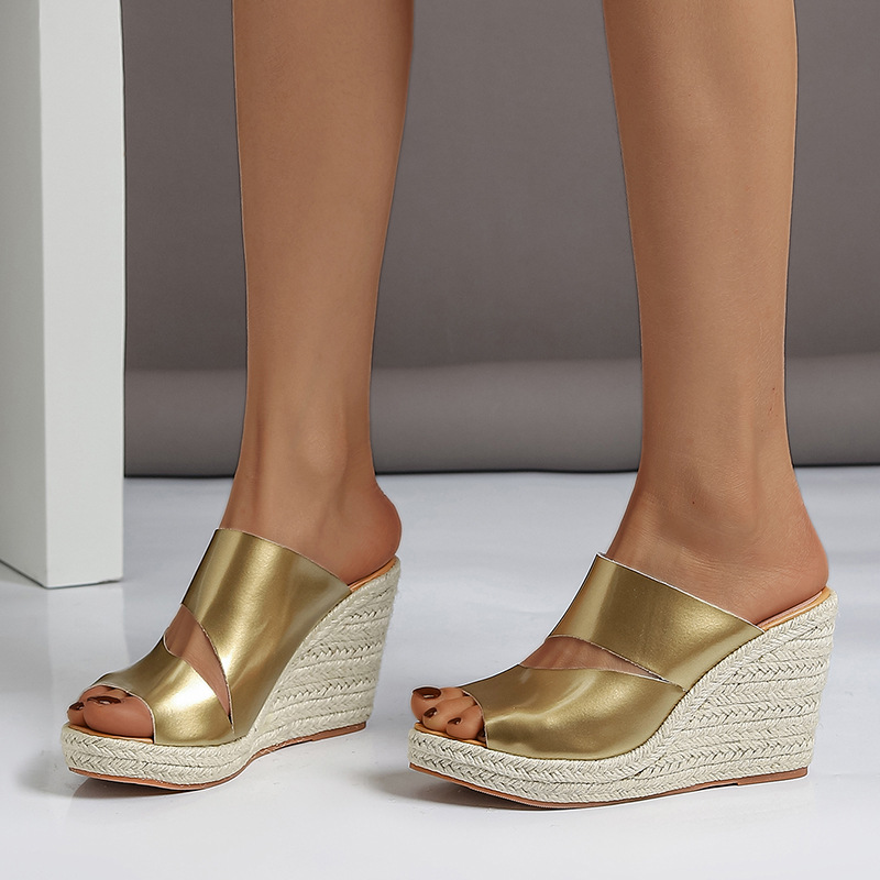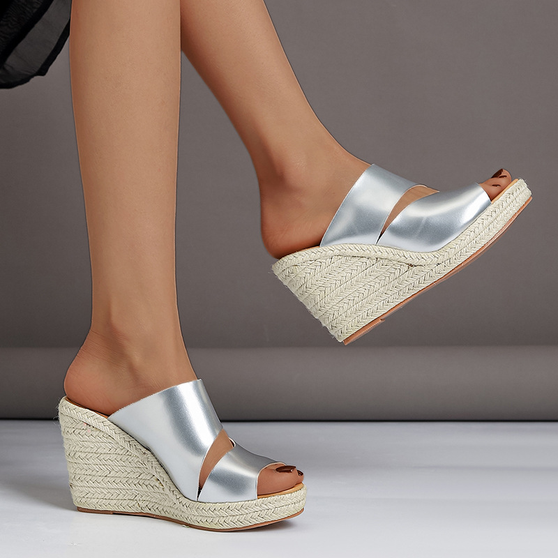 Wongn Wongn High Heel Thick Bottom Cool Slippers Female Dew Toe Grass Knitting Hemp Rope Bottom