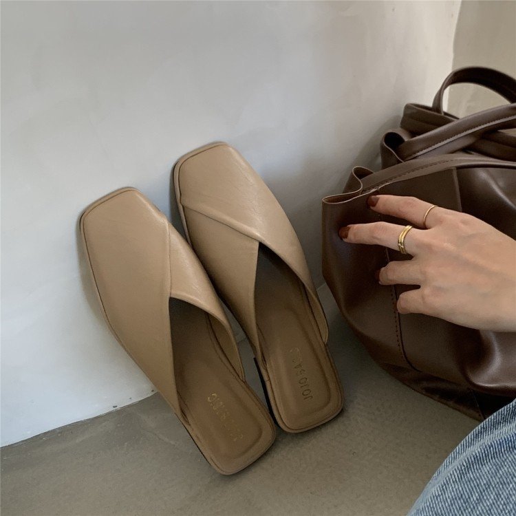 Wongn Wongn Lazy Slippers Korean Version Of Fashion Square Head Baotou Half Drag Without Heel Flat Sandals Women's Shoes