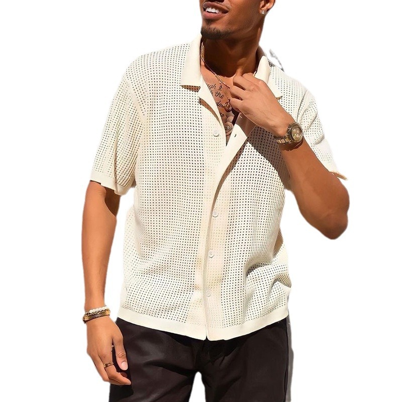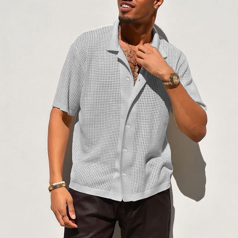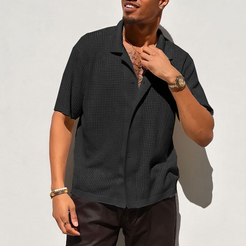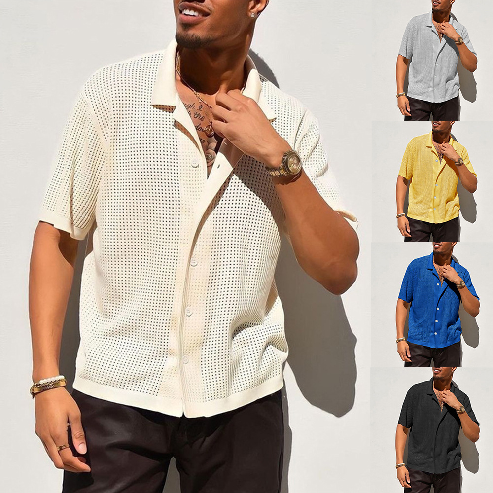 Wongn Wongn Men's Casual Knit Shirt Men's Summer New Solid Color Lapel Hollow Out Breathable Men's Short-Sleeved Jacket