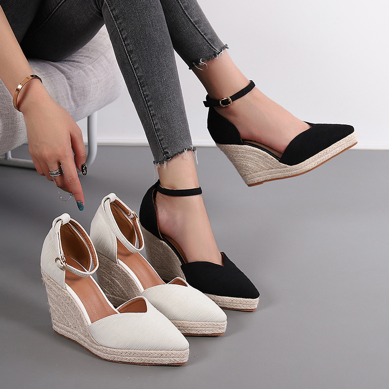 Wongn Wongn New Pointed Toe Slope Platform High Heel Sandals Hollow Shoes With Buckle Straw Hemp Rope Bottom