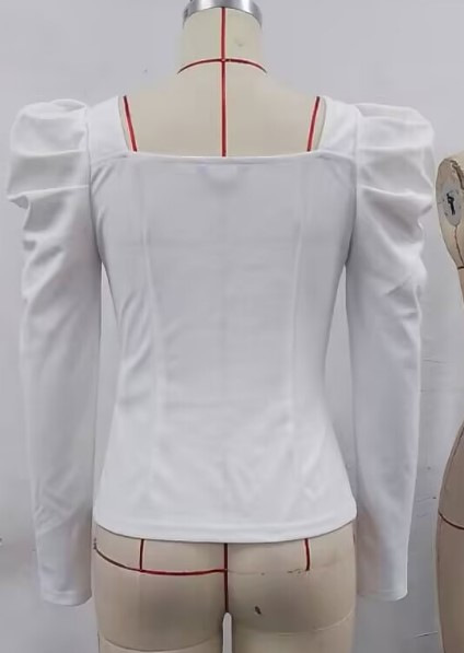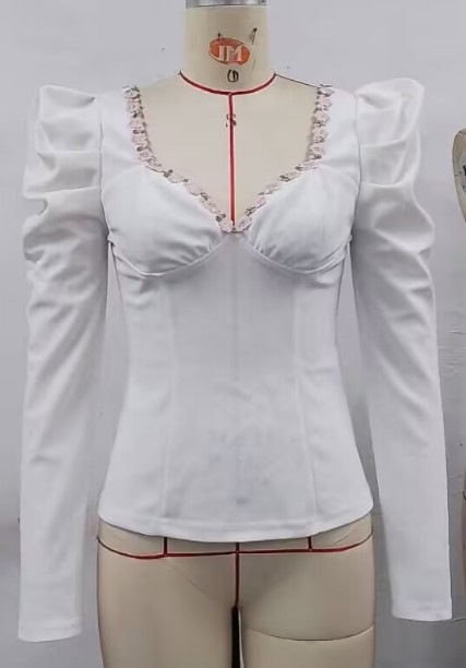Wongn Wongn New Women's Lace Lace Decorated With Bubble Sleeves Long Sleeves V-Neck T-Shirt Slim Top