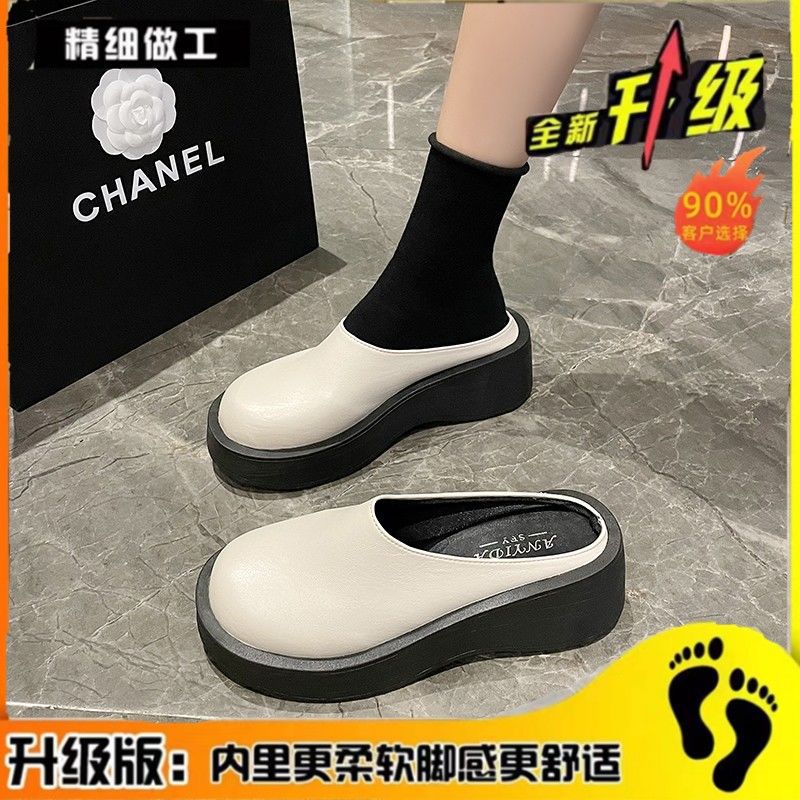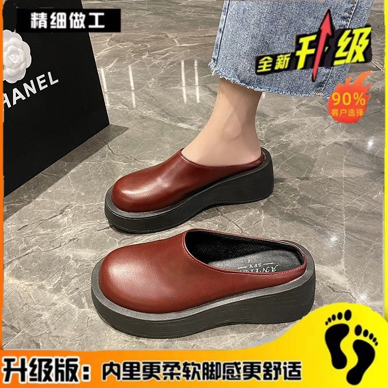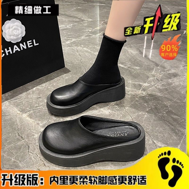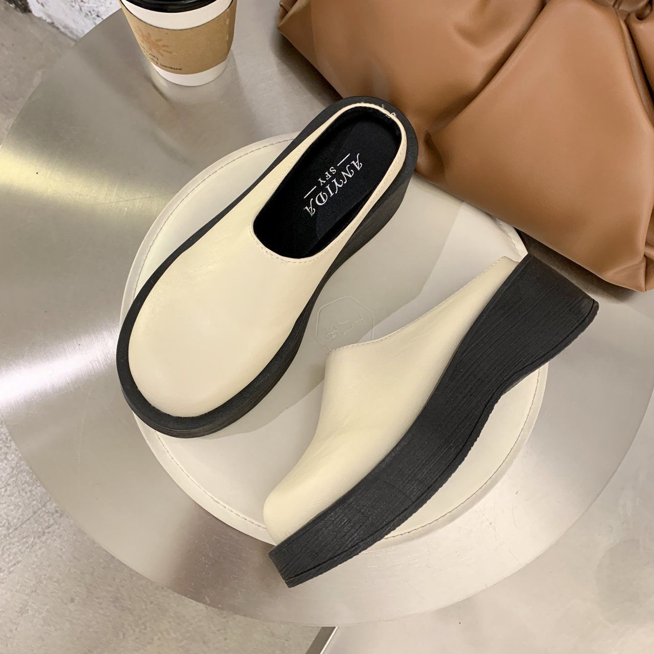 Wongn Wongn Platform Bottom Shoes Female Real Leather Skin Cool Drag High Heel Waterproof Table Slippers Summer Outside Slope Heel Head Half Drag