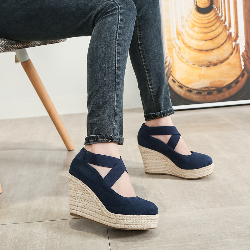 Wongn Wongn Slope Heel 2023 New Spring And Autumn Round Head Fashion Thick Sole High Heel Cross Belt Single Shoe Straw