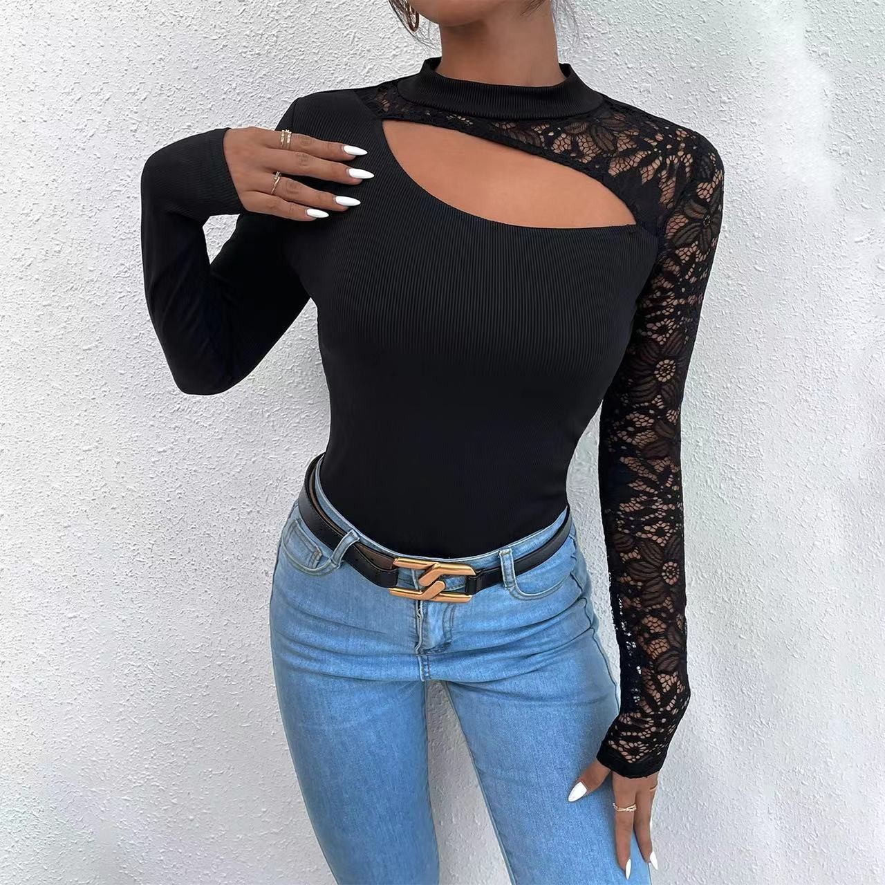 Wongn Wongn Spring And Autumn Sexy Off-The-Shoulder Lace Irregular Long-Sleeved T-Shirt Hanging Neck Women's Sexy T-Shirt