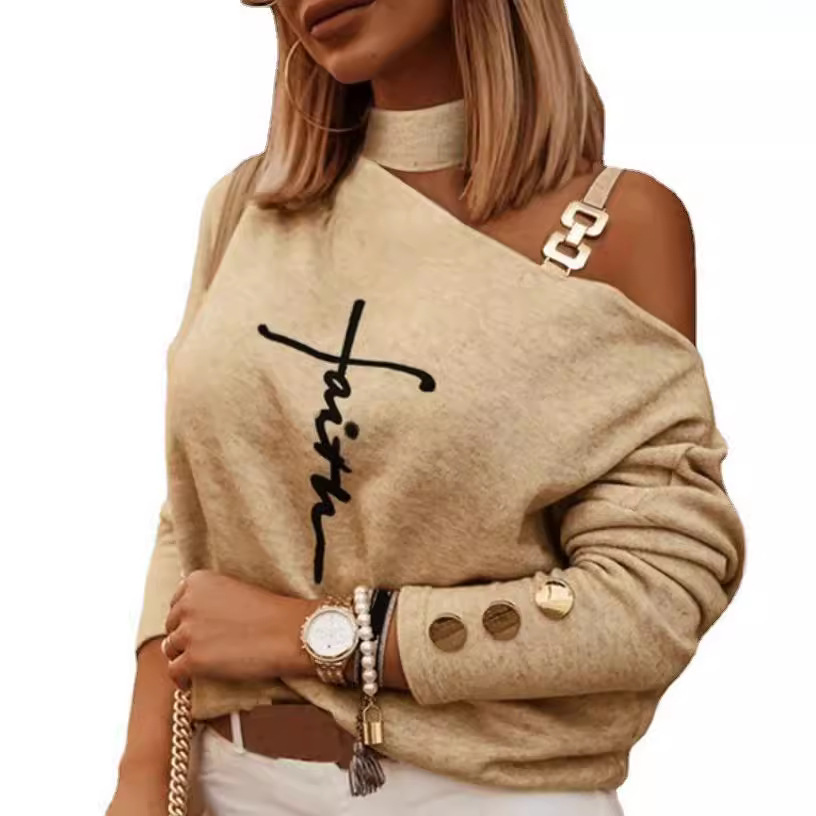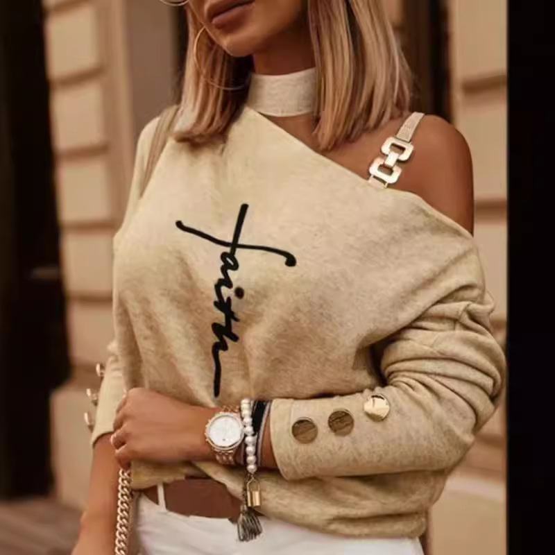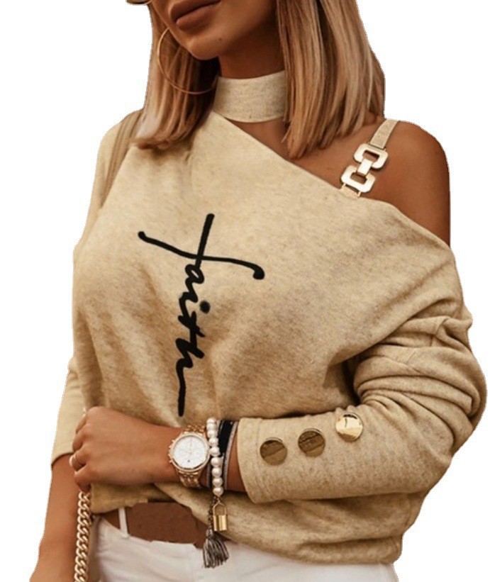 Wongn Wongn Street Style Irregular Shoulder Strap Nail Button Print Long Sleeve Off-Shoulder T-Shirt