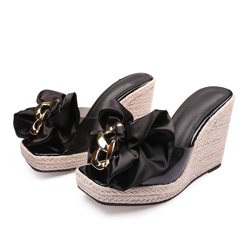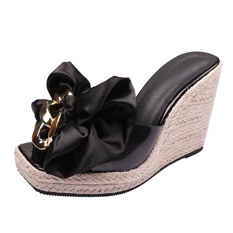 Wongn Wongn Style Summer Square Head Slope With Thick Bottom High Heel Slippers Female Bowknot Flower Glass Glue Sandals