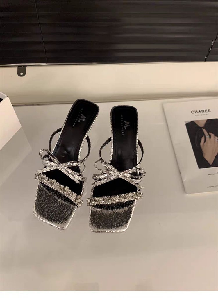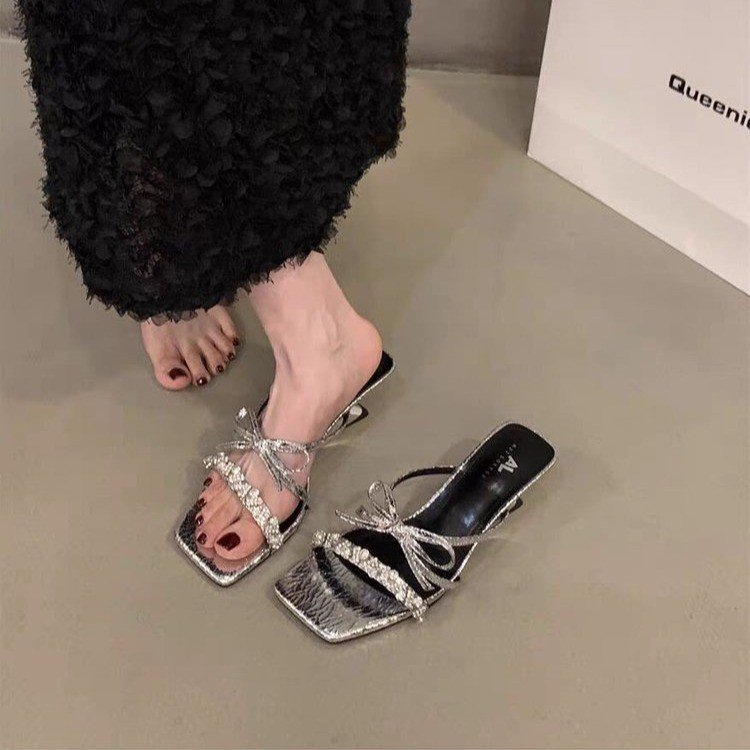 Wongn Wongn Summer New Fashion Rhinestone Bow One Word High Heel Cool Drag Slippers Women's Shoes
