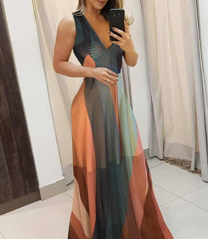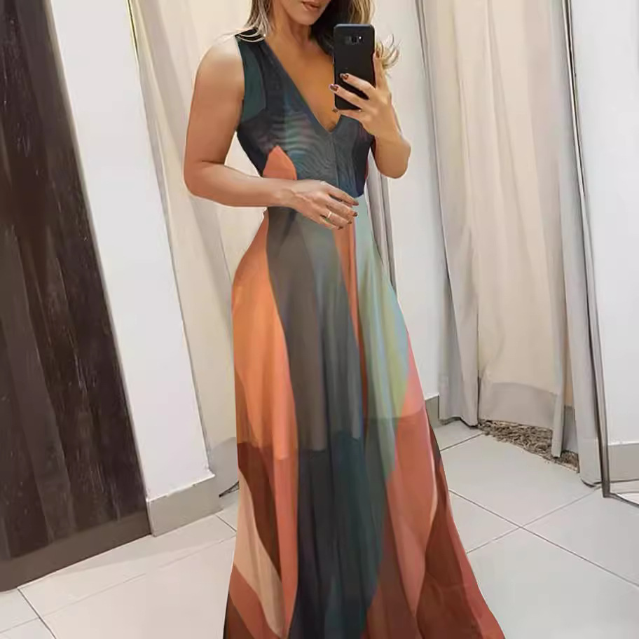 Wongn Wongn Temperament Commuter V Collar Sling Sleeveless Color Color Print Long Waist Dress