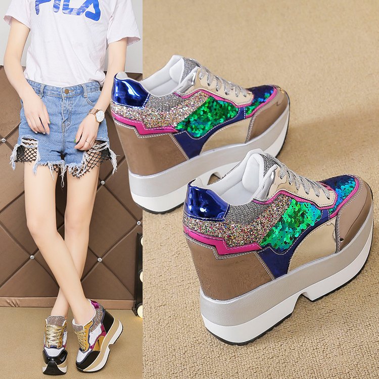 Wongn Wongn Women's Shoes Sequins Spell Color Belt Platform Inside Increased Ultra High Heel Casual Shoes Sports Shoes Women's Shoes