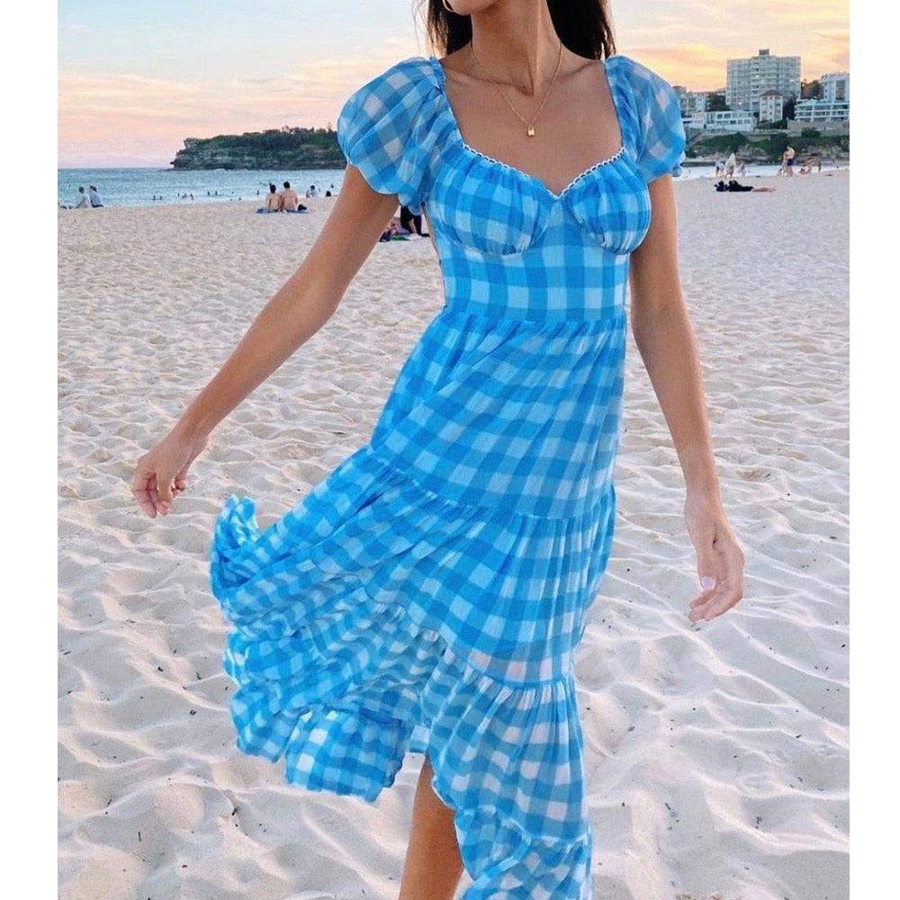 wsevypo Women Square Collar Midi A-Line Dress Boho Puff Short Sleeve High Waist Bandage Dress Summer Elegant Wedding Party Wear